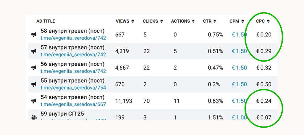 4. Запустили трафик в стандартном кабинете Telegram Ads с текстами. Удалось снизить цену подписчика с 4,5 € до 3 €, однако снижение цены было недостаточным.