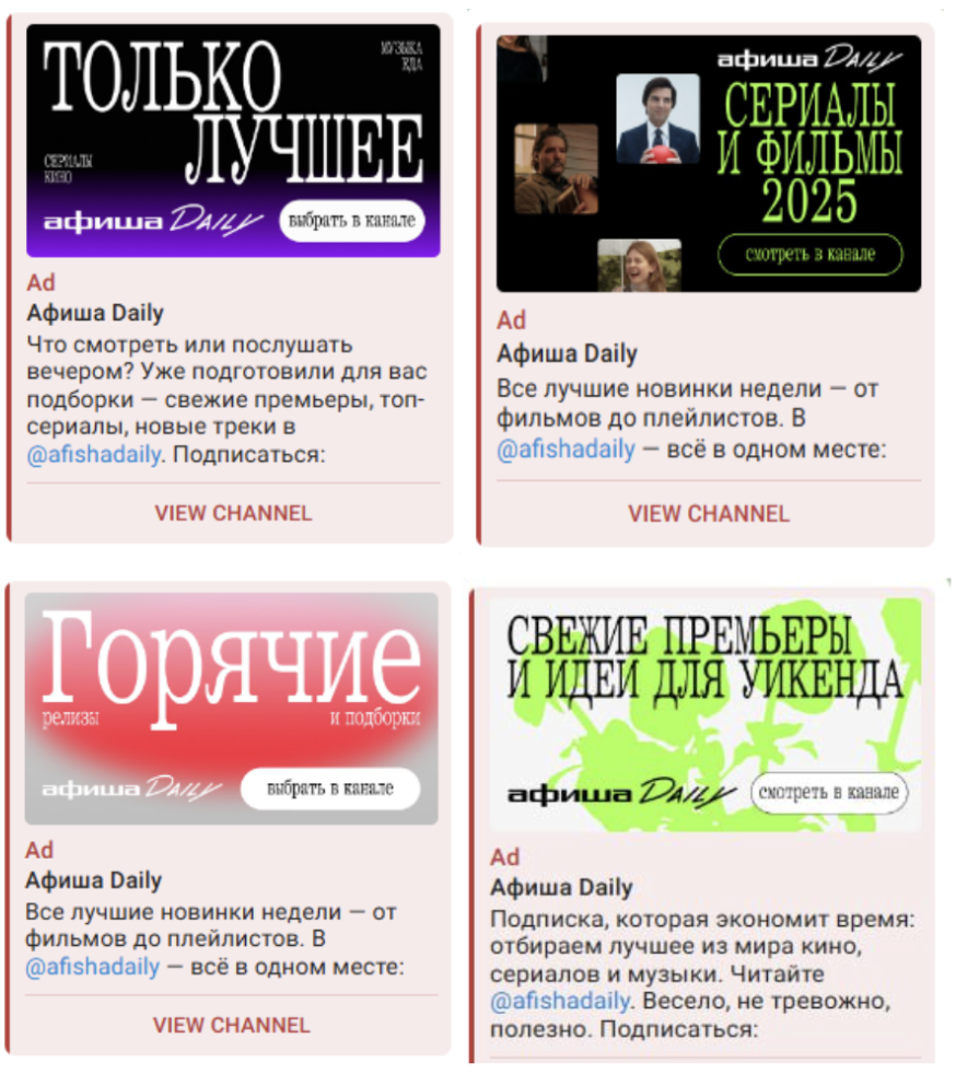 О проекте:Афиша Daily — молодёжное медиа о развлечениях: фильмы, сериалы, музыка, тренды соцсетей и форматы онлайн-досуга. Канал публикует подборки и рекомендации для широкой городской аудитории.