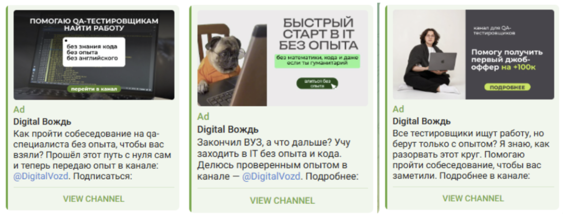 О проекте:DigitalVozd — Telegram-канал эксперта, который обучает IT-профессии QA-тестировщика без знания английского и навыков программирования.