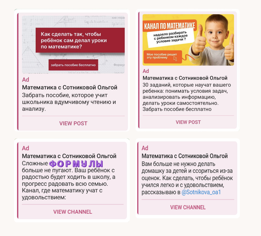 3. Подготовили тексты с упором на боли и потребности родителей: низкие оценки, потеря интереса к учёбе и т. д. Объявления вели как в канал, так и на пост с лид-магнитом с проверкой подписки. Лид-магнит нужен для того, чтобы собрать заявки на бесплатные консультации и увеличить вовлеченность аудитории.