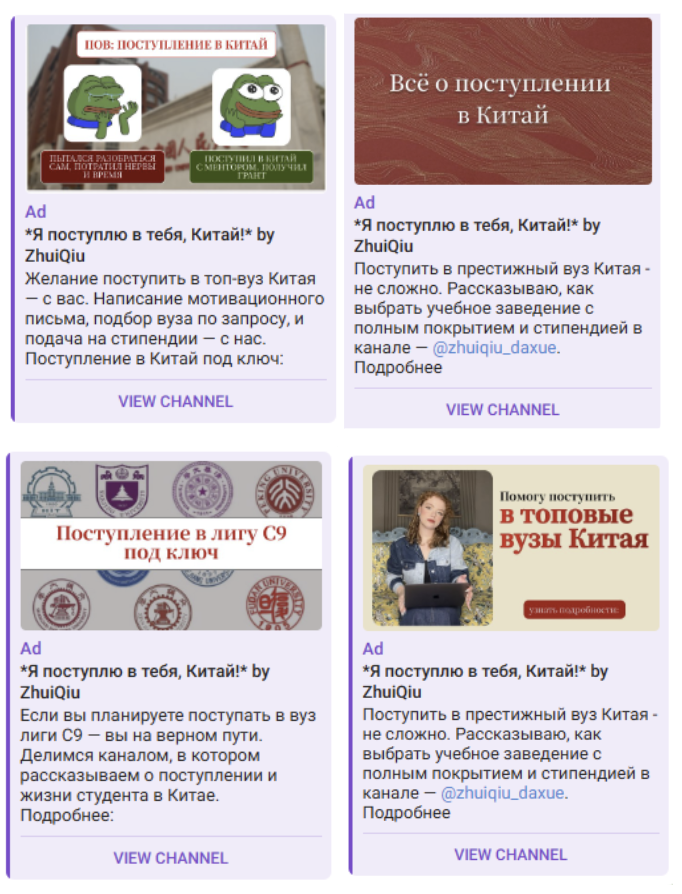 2. Подготовили рекламные тексты с акцентом на боли аудитории: желание поступить в престижный вуз Китая, получить стипендию. С самого начала работы усиливали рекламные объявления баннерами.